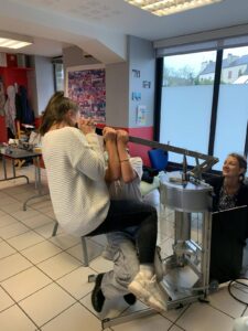 Les participant·es expérimentent concrètement le recyclage du plastique, en manipulant deux machines originales : une presse à injecter et un vélo broyeur de bouchons.